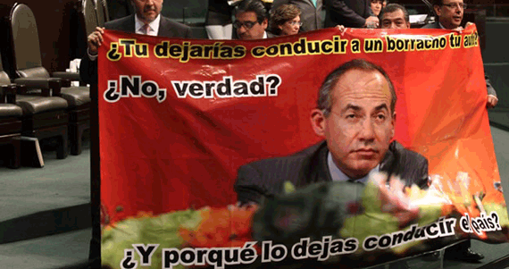 El viernes 4 de febrero de 2011. Carmen Aristegui se refirió en su espacio matutino a la protesta que diputados del Partido del Trabajo realizaron en San Lázaro, donde colocaron una manta con la fotografía del presidente Felipe Calderón en la que se leía: ¿Tú dejarías a un borracho conducir tu auto? No, ¿verdad? ¿Y por qué lo dejas conducir al país?