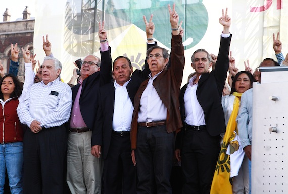 Cuahutémoc Cárdenas junto con la élite política del PRD, en un mitin en contra de la privatización de Pemex.