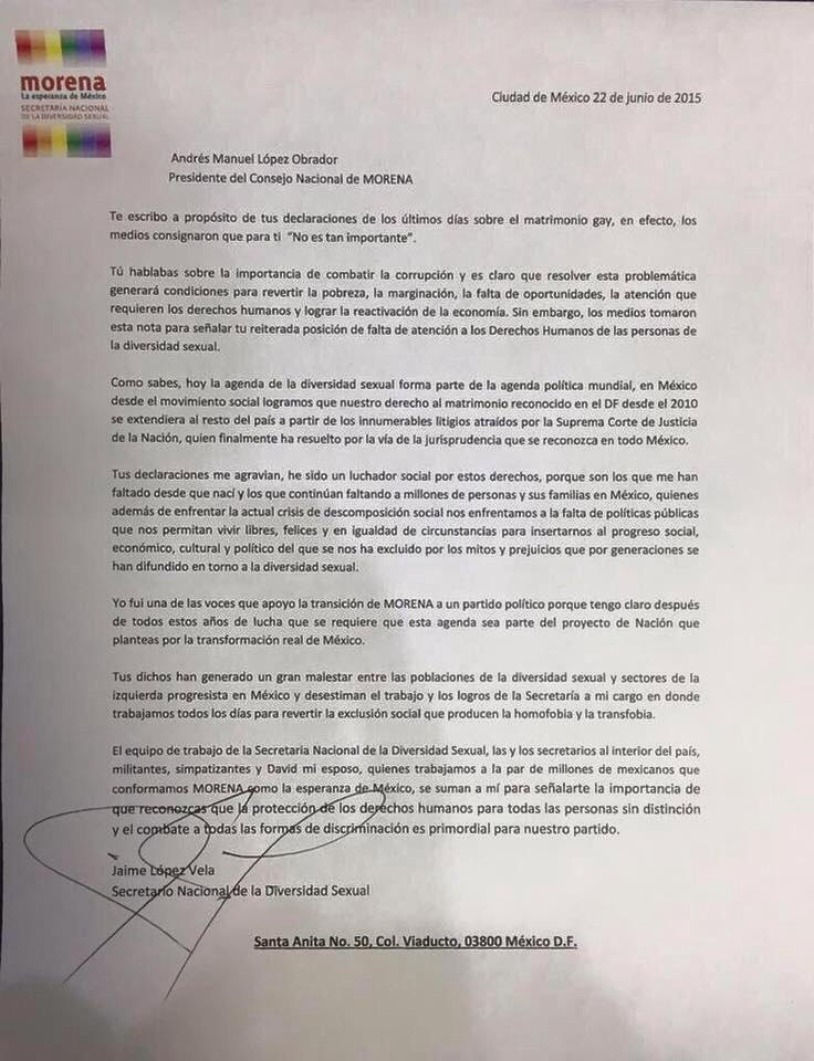Estoy de acuerdo con Jaime. Yo sé que a AMLO, tan le importan los derechos humanos de absolutamente toda la población, que Morena es el único partido que cuenta con una Secretaría de la Diversidad. Sin embargo, considero que debe ser mucho más cuidadoso en sus declaraciones, pues conociendo el encono gubernamental y de la gran mayoría de los medios de comunicación, cualquier gesto, palabra o frase que menciona, la utilizan en su contra.