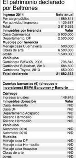 De acuerdo con la declaración patrimonial que publicó en el sitio electrónico 3de3.mx, el monto total de las propiedades de Beltrones es de 21 millones 882 mil 873 pesos.