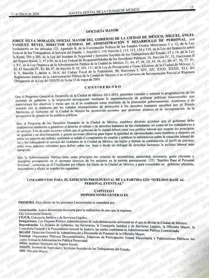 El Gobierno de la capital del país solicitó a la Oficialía Mayor autorización para llevar a cabo la acción de gobierno a través de la partida presupuestal 1221, denominada “Sueldos de Base al Personal Eventual”, de acuerdo con una publicación en la Gaceta Oficial de la Ciudad de México del 31 de marzo de 2016.