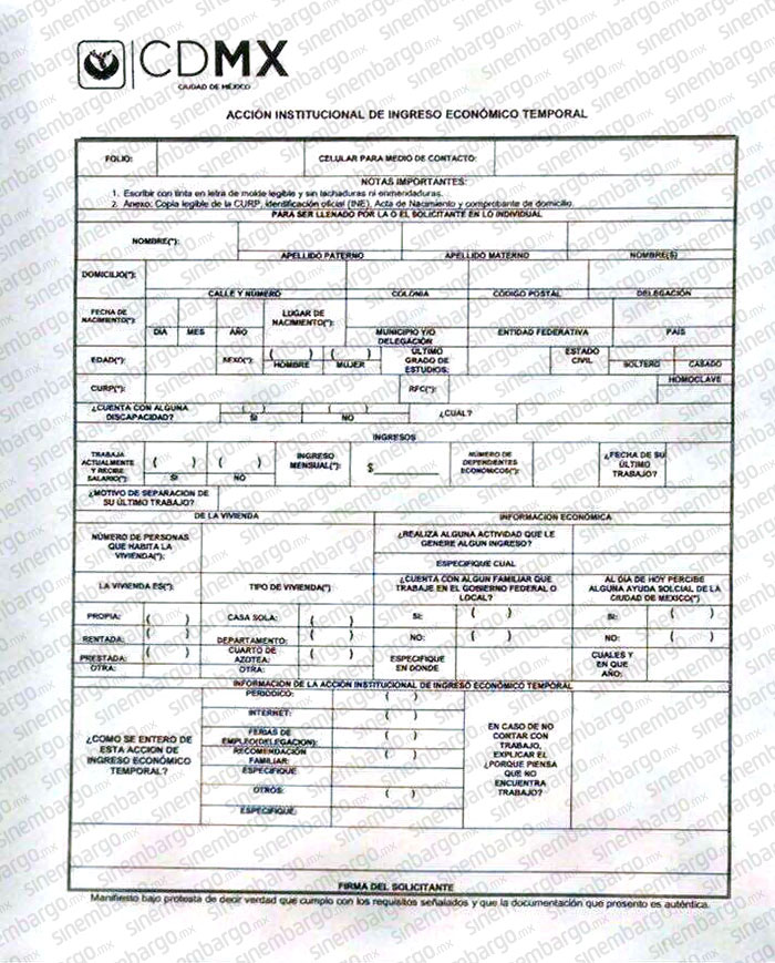 Solicitud de empleo temporal que se reparte en delegaciones del PRD, de acuerdo con las acusaciones de los líderes de PAN y Morena en la CdMx. Foto: SinEmbargo