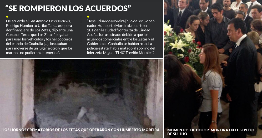 Los Zetas tuvieron “una pelea con el ex Gobernador Moreira y terminaron asesinando a su hijo en venganza por la muerte de un pariente cercano de Treviño Morales. Eso sucedió cuando el actual Gobernador de Coahuila, Rubén Moreira Valdez, quien también es el hermano de Humberto Moreira, decidió encarar a Los Zetas. La nueva postura de Coahuila contra Los Zetas consistió en la creación de una unidad especial de la policía conocida como Los GATES. Ese grupo fue creados para erradicar a Los Zetas”, expresó.
