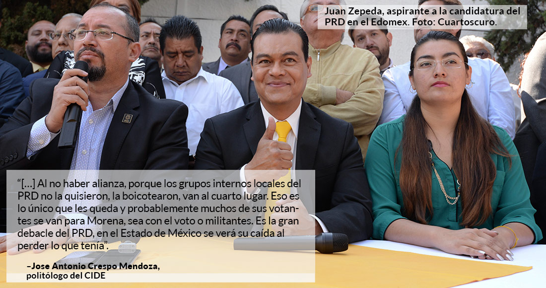 “El PRD no tiene posibilidades, ninguna. Tenía la posibilidad de ir con el PAN y de hacer una alianza, por ejemplo, con Josefina. Así el PRD podría ser uno de los ganadores como ocurrió el año pasado. Pero al no haber alianza, porque los grupos internos locales del PRD no la quisieron, la boicotearon, van al cuarto lugar. Eso es lo único que les queda y probablemente muchos de sus votantes se van para Morena, sea con el voto o militantes. Es la gran debacle del PRD, en el Estado de México se verá su caída al perder lo que tenía”, consideró Jose Antonio Crespo Mendoza, politólogo del Centro de Investigación y Docencia Económicas (CIDE).
