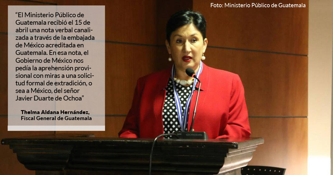 — El Ministerio Público de Guatemala recibió el 15 de abril una nota verbal canalizada a través de la embajada de México acreditada en Guatemala. En esa nota el Gobierno de los Estados Unidos Mexicanos nos pedía la aprehensión provisional con miras a una solicitud formal de extradición, o sea a México, del señor Javier Duarte de Ochoa de nacionalidad mexicana. De tal manera que antes del 15 de abril el Ministerio Público de Guatemala no podía actuar en función de extradición porque no había una solicitud. No se había recibido esta nota verbal del Gobierno de los Estados Unidos Mexicanos.