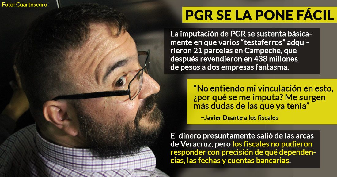 La imputación de la PGR en contra de Javier Duarte se sustenta, en buena medida, en que varios testaferros supuestamente adquirieron 21 parcelas en el estado de Campeche, las cuales después revendieron en 438 millones de pesos a dos empresas fantasma, aparentemente creadas por la misma organización. Sin embargo, tras una audiencia de más de cinco horas y media, los fiscales federales mostraron poca preparación para presentar el caso y sólo lograron acreditarle el desvío de 38.5 millones de pesos.
