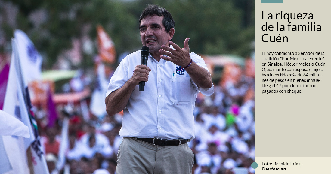 El hoy candidato a Senador de “Por México al Frente”, Héctor Melesio Cuén Ojeda, junto con esposa e hijos, han invertido más de 64 millones de pesos en bienes inmuebles; el 47 por ciento fueron pagados con cheque.