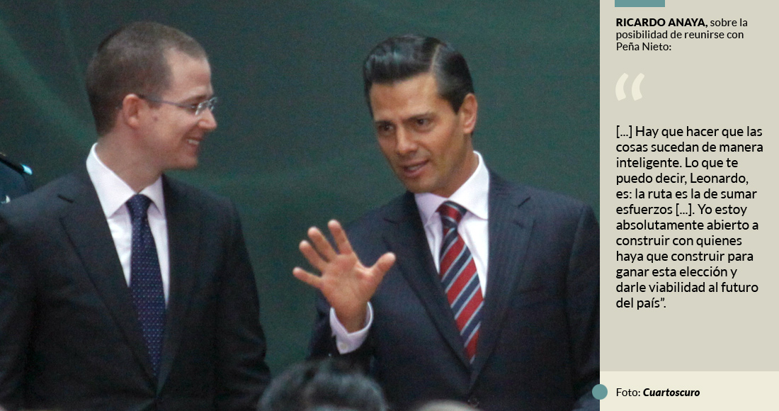 La revista Proceso dio a conocer ayer que, ante miembros del grupo financiero Citibanamex, Anaya manifestó “de manera expresa su disposición a hablar directamente con el Presidente Enrique Peña Nieto para ‘construir’ una alianza que derrote a López Obrador”.