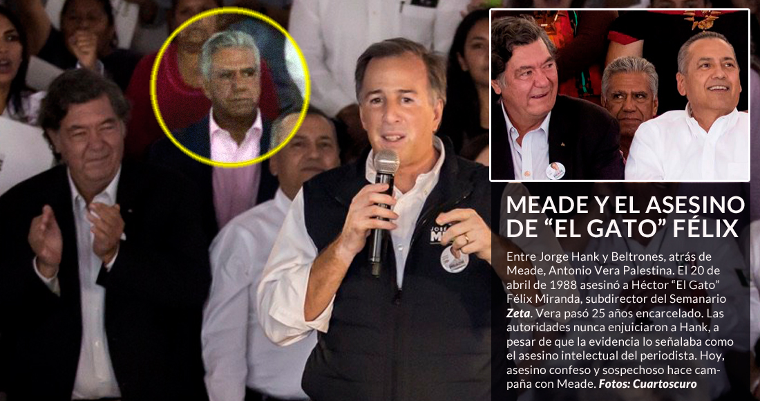 Meade Kuribreña ha insistido en atacar a Nestora y en su posición de estar “del lado de las víctimas”, una frase que, sin embargo, se puso en duda el 11 de mayo pasado, cuando en una reunión con simpatizantes en Tecate, Baja California, estuvo rodeado del empresario priista Jorge Hank Rhon y su hombre de seguridad Antonio Vera Palestina, quien el 20 de abril de 1988 –junto a Victoriano Medina–, asesinó a balazos al periodista cofundador de ZETA, Héctor “El Gato” Félix Miranda.